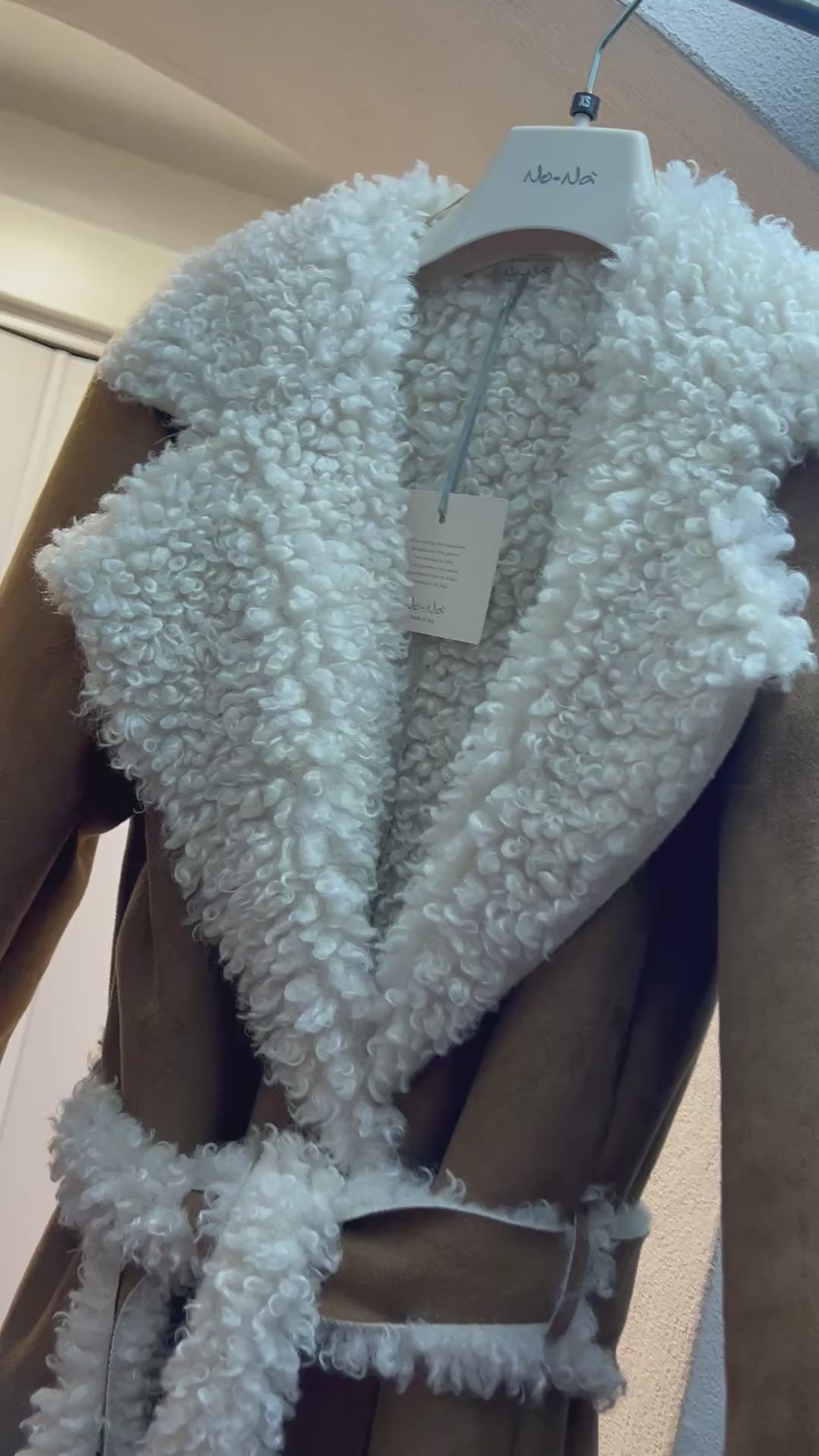 Un cappotto lungo e avvolgente in montone, perfetto per l'inverno. Il capo è caratterizzato da un design elegante con shearling a contrasto, visibile su collo, revers, polsini e orlo, che ne esalta la silhouette. La cinta in vita, nello stesso materiale, permette di definire la figura. Le ampie tasche laterali e la chiusura frontale completano il look, rendendolo un capo versatile e sofisticato per affrontare il freddo con stile.